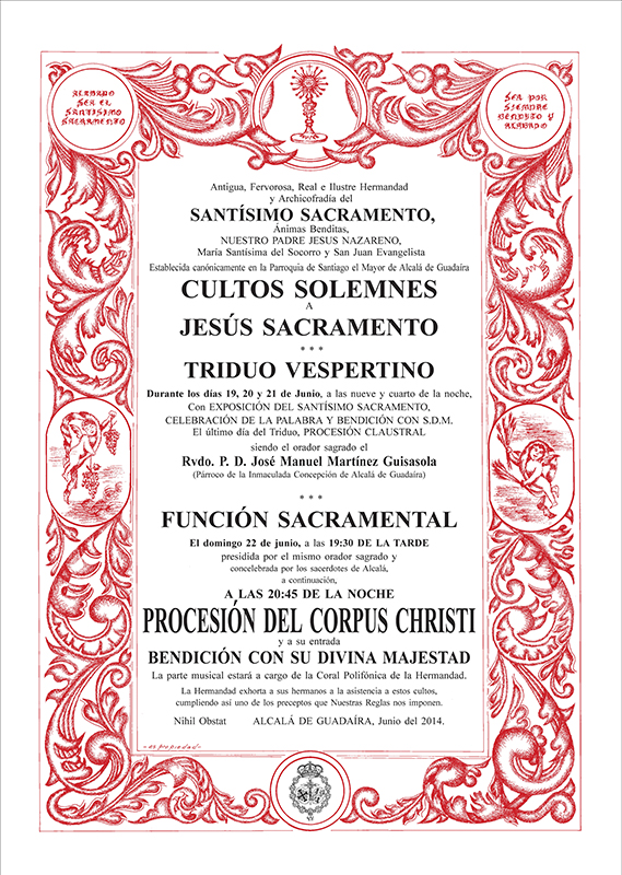 El domingo 22 de junio, a las 19:30 horas Función Sacramental presidida por el mismo orador sagrado y concelebrada por los sacerdotes de Alcalá.