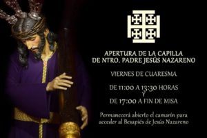Hoy viernes 8 de marzo, no habrá misa de Jesús al coincidir con el triduo de la Hermandad de la Divina Misericordia.  Informar que durante los viernes de cuaresma el camarin y la capilla permanecerán abiertos por la mañana en horario de 11:00 a 13:00 horas y por la tarde de 17:00 a 21:000 horas. Como cada día el Señor espera nuestra oración y ofrenda.