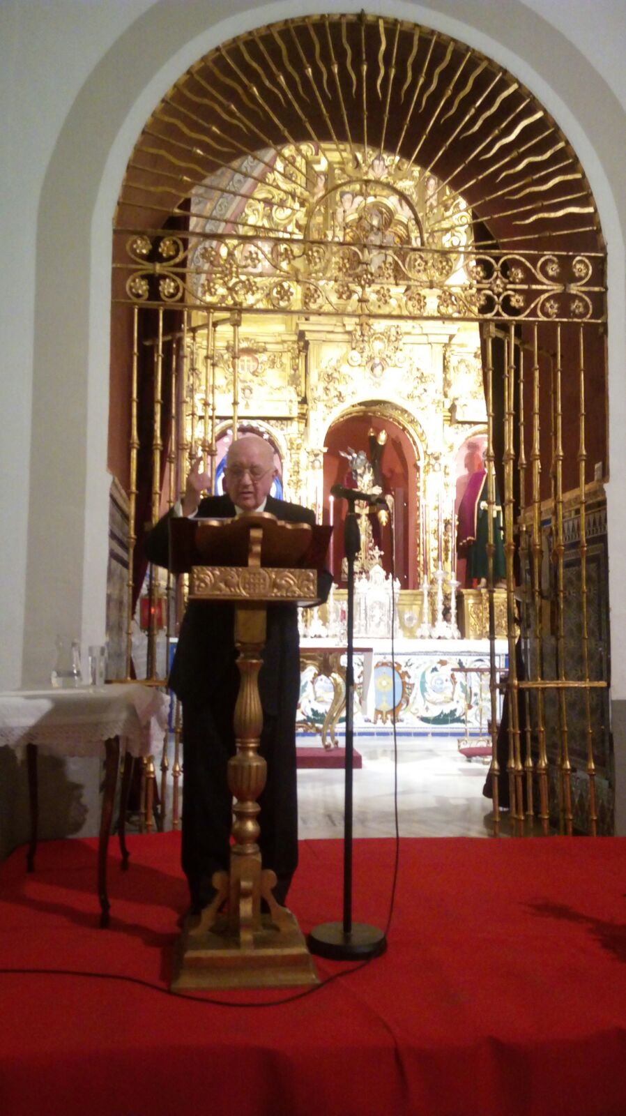 Final. Estruendo de aplausos que estallan en la penumbra de la iglesia, agradecido D.  Vicente recibe y palpa el cariño de los asistentes que una vez más han tenido la dicha de volver a escuchar la cálida, sencilla a la par que elegante y serena oratoria de nuestro hermano predilecto, haciendo verdad una vez más aquella frase célebre del escritor del siglo de oro , Baltasar Gracián: “lo bueno breve, dos veces bueno”. D. Vicente, persona dotada de un intelecto y corazón extraordinario, a su 92 años, pronunció un pregón magnífico, sublime, lleno de clarividencia, sensatez, fervor, devoción y entrega a unos Titulares y a una Hermandad de la que ha sido testigo y partícipe, privilegio vivo del cual no sólo la Hermandad de Jesús debe sentirse orgullosa, sino toda Alcalá, que lo vio nacer.